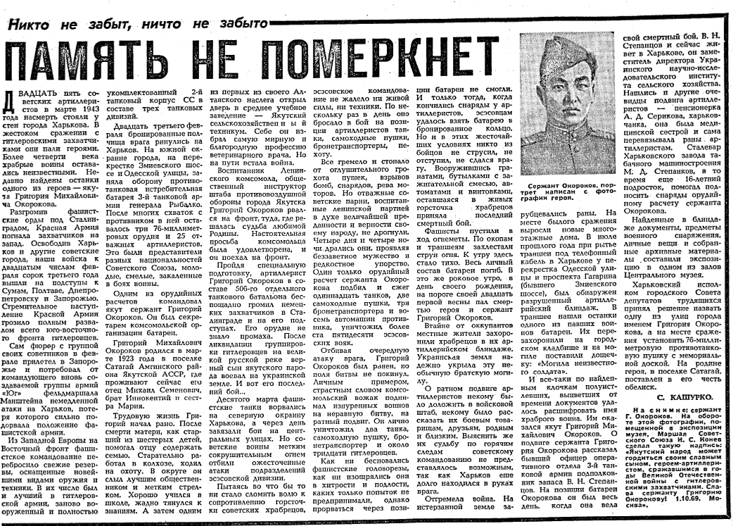 Личность бойца удалось установить благодаря кропотливой работе журналиста журнала «Сельская новь» Александра Кашурко. Узнав о находке, он прибыл из Москвы и настоял на вскрытии могилы для проведения экспертизы. В потайном кармане он обнаружил и восстановил пробитые осколками и залитые кровью документы: удостоверение сержанта Григория Михайловича Окорокова и его зачетную книжку Якутского сельхозтехникума.