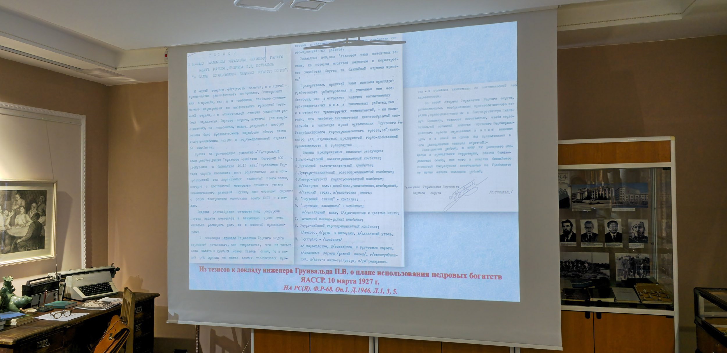 Директор Национального архива РС(Я) Петр Румянцев рассказал о богатом фонде, посвященном Якутской комплексной экспедиции Академии наук СССР. Один из ценных документов – доклад 1925 года из личного фонда Максима Аммосова. В рамках конференции отдел научного использования документов Национального архива организовал выставку, где представил документы за 1924-1933 годы.