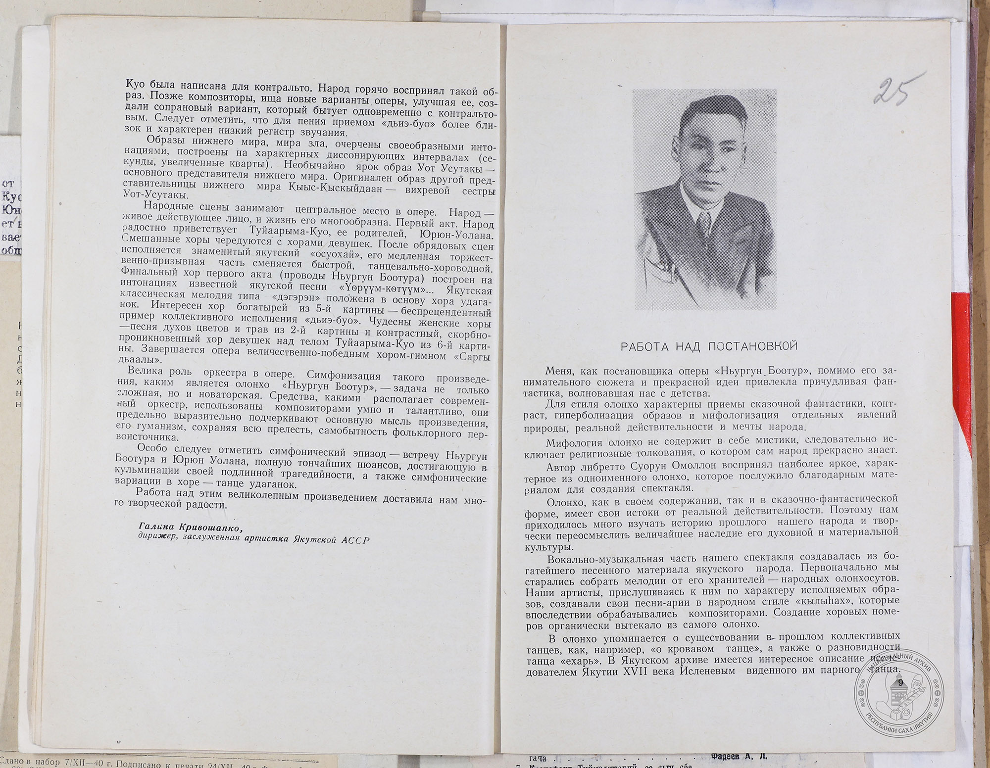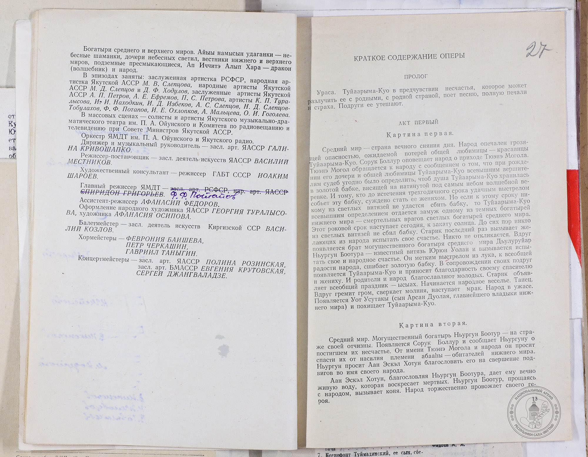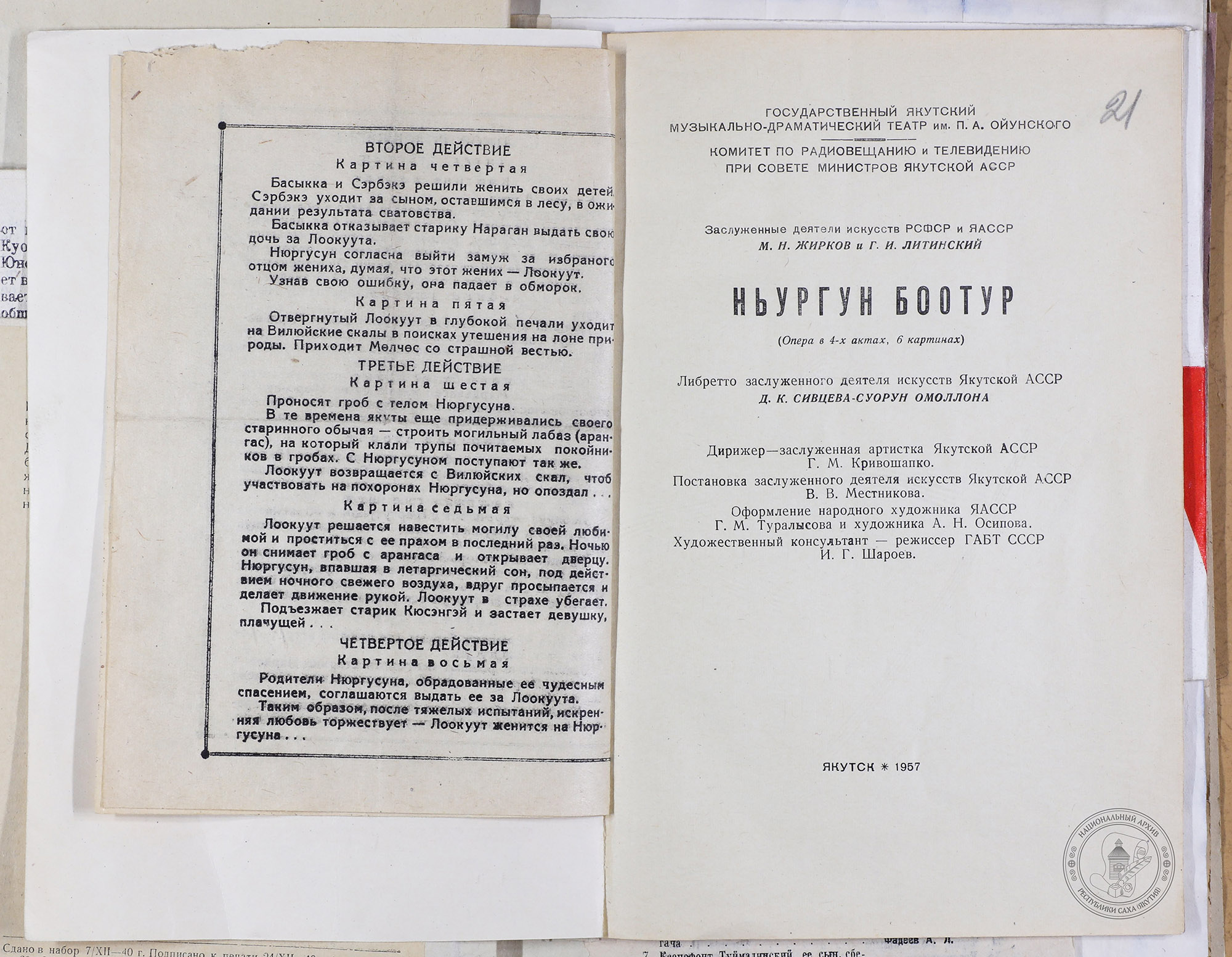 В нашем фонде хранится программа 1957 года, позволяющая заглянуть в историю этого монументального четырехактного произведения. Оркестром управляла заслуженный деятель искусств РСФСР Галина Кривошапко, а постановку осуществил заслуженный деятель искусств ЯАССР Василий Местников.