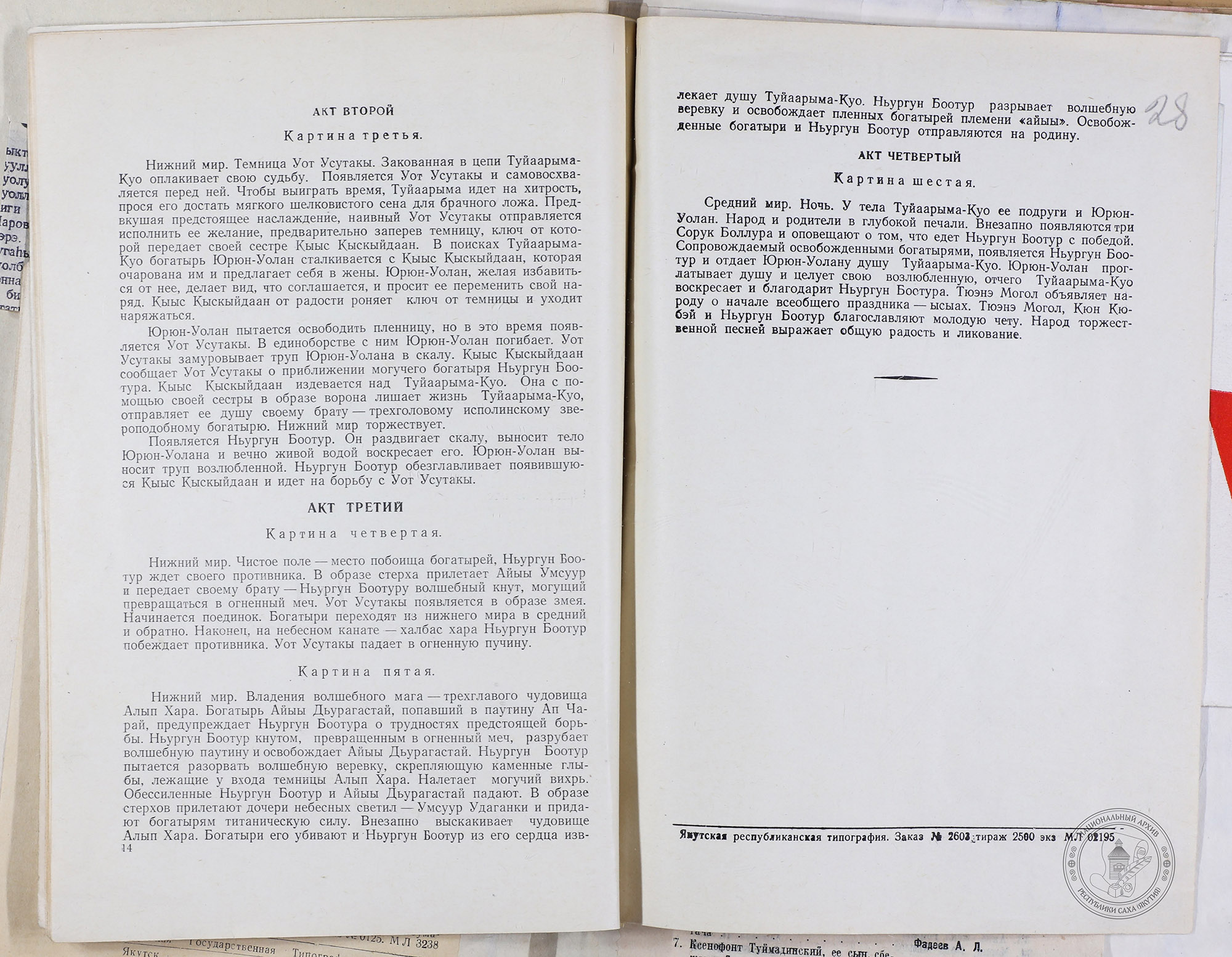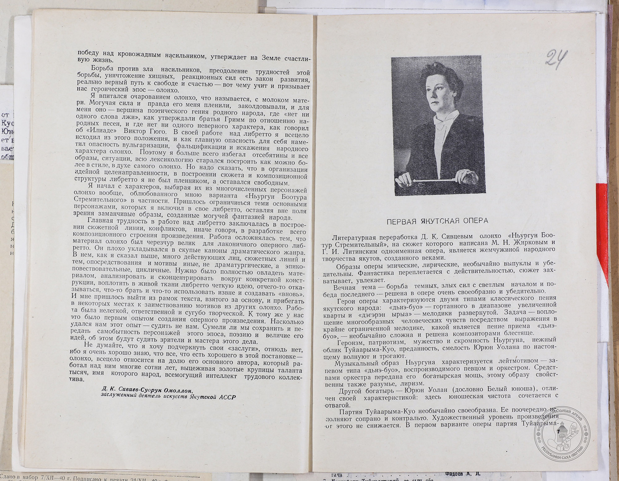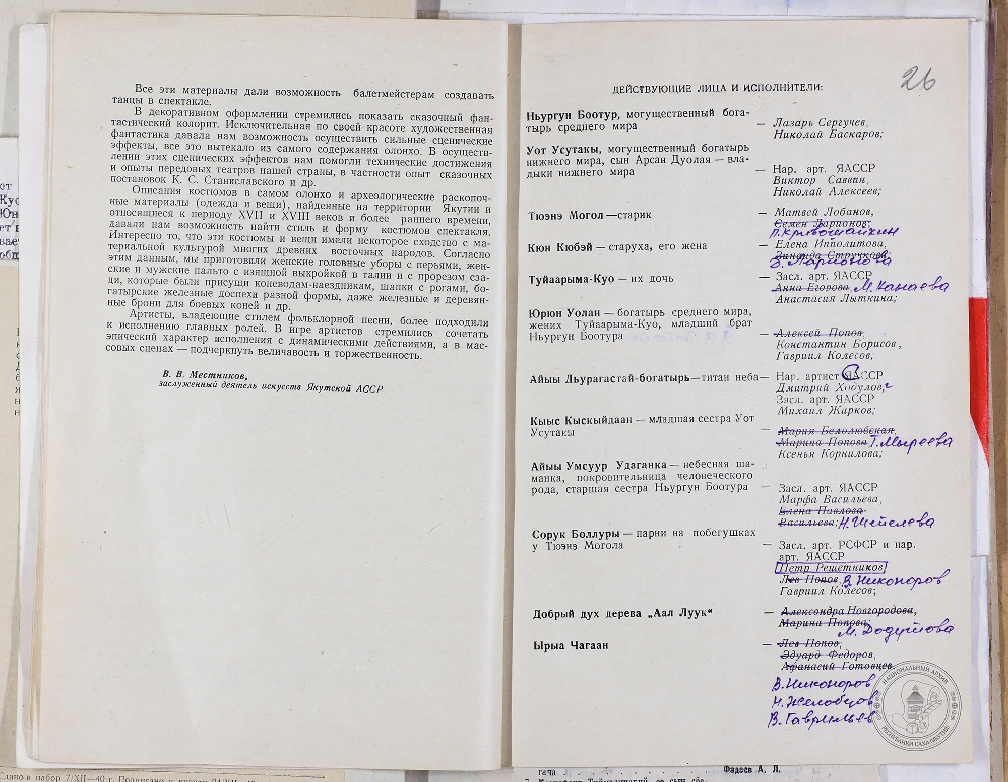 В нашем фонде хранится программа 1957 года, позволяющая заглянуть в историю этого монументального четырехактного произведения. Оркестром управляла заслуженный деятель искусств РСФСР Галина Кривошапко, а постановку осуществил заслуженный деятель искусств ЯАССР Василий Местников.